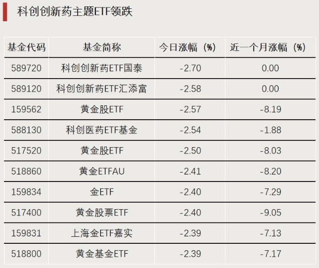科创创新药相关ETF跌幅较大,科创创新药ETF国泰、科创创新药ETF汇添富、科创医药ETF基金均跌超2%。