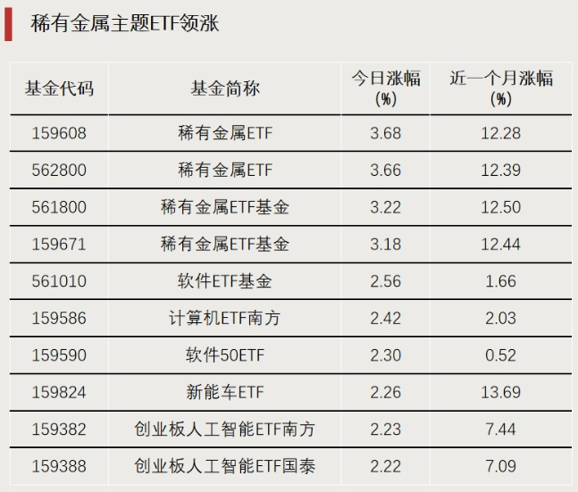 11月17日,稀有金属ETF领涨,4只稀有金属ETF涨幅超过3%。AI应用板块爆发,软件ETF基金、创业板人工智能ETF南方等相关ETF涨超2%。