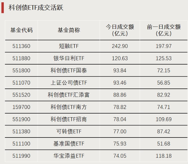 今天债券型ETF成交活跃,成交额排名前十的ETF中,有8只是债券型ETF,其中,有多只是科创债ETF。